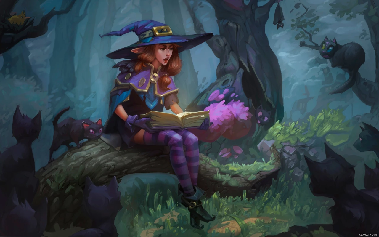 a pointed hat and has a book open on her lap which she seems to be reading or studying. There are several cats of