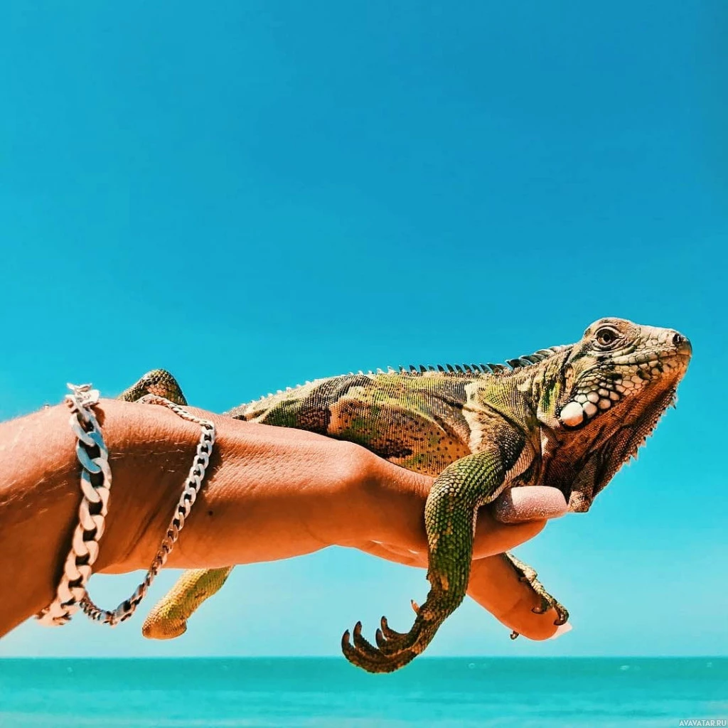 На картинке изображена рука человека, держащая игуану. Игуана - ящерица с чешуей, и она, кажется, покоится на ладони. Фон предполагает, что эта фотография, возможно, была сделана на пляже в дневное время, на что указывает ясное голубое небо.
