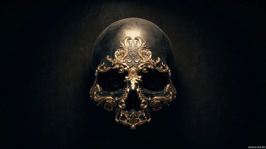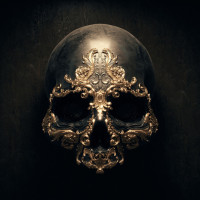 decorative designs. It's a stylized representation often associated with symbols of mortality or the macabre. The detailed artwork on the skull suggests it could be related to themes such as the Grim Reaper, the Day of the Dead (Día de los Muertos), or