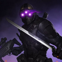 a large sword in one hand and what looks like a tactical gun in the other. They are wearing a helmet with a visor and