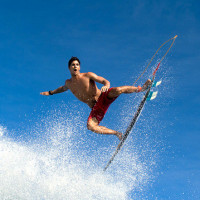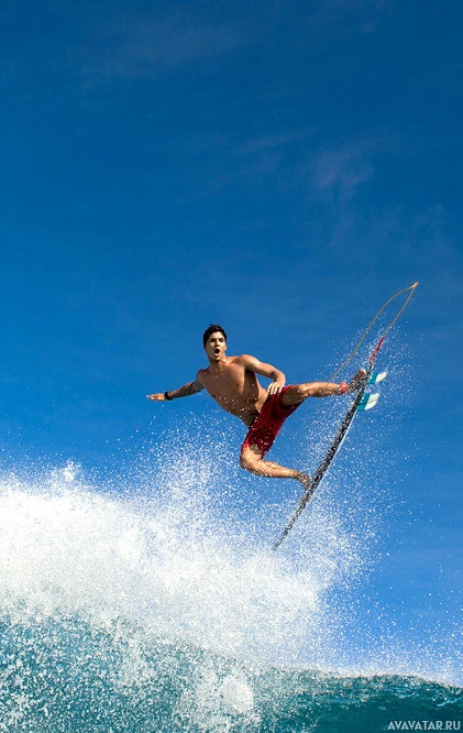 The image shows a man surfing on a wave. He is shirtless, wearing red shorts, and riding the wave on a surfboard. The sky is clear, indicating good weather conditions for surfing.