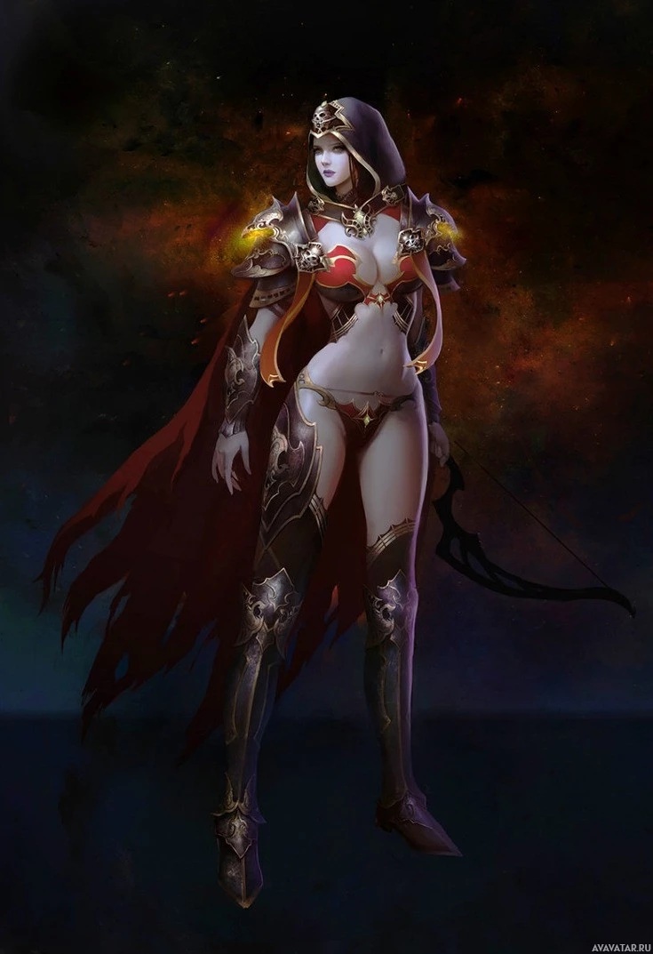 a female warrior or hooded figure. She is wearing elaborate armor with