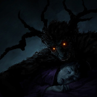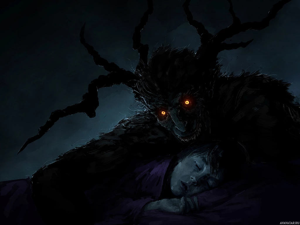 a horror scene. A monster with a menacing appearance is shown looming over a sleeping individual. The monster has dark fur, sharp claws, and glowing