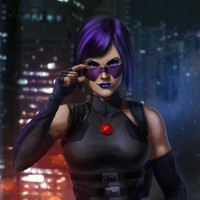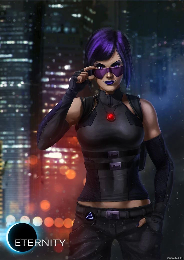 purple hair, is wearing sunglasses, and is dressed in a black outfit with a distinctive red mark on her chest and arm. This character is known for her role as one of