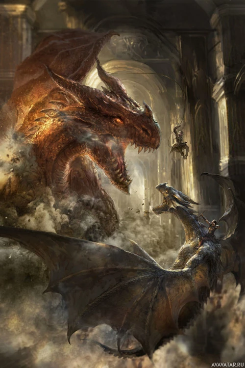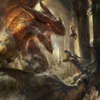 a fantasy scene featuring a large dragon and several smaller dragons or dragon-like creatures. The setting appears to be a grand arched structure, possibly an entrance to a palace or temple, with smoke and debris surrounding the scene, indicating some form of battle or confrontation. The style is highly detailed and suggests a dramatic, high-stakes moment in