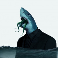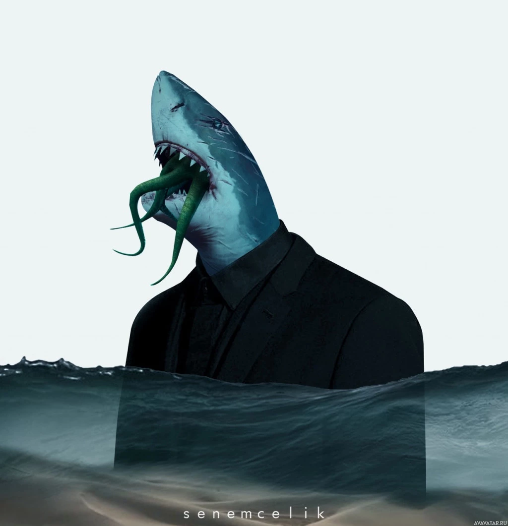 the face of a human. It appears to be a creative artistic representation or illustration. The shark has the upper body and face of a man wearing
