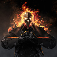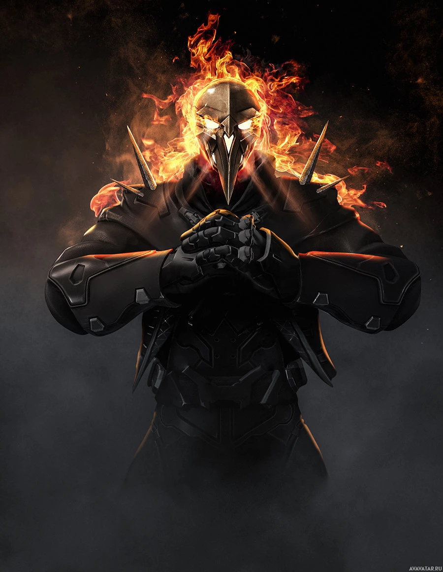 a fiery background with his arms crossed and has flames emanating from his body, symbolizing his powers which include control over fire. The character is wearing a black armor with