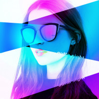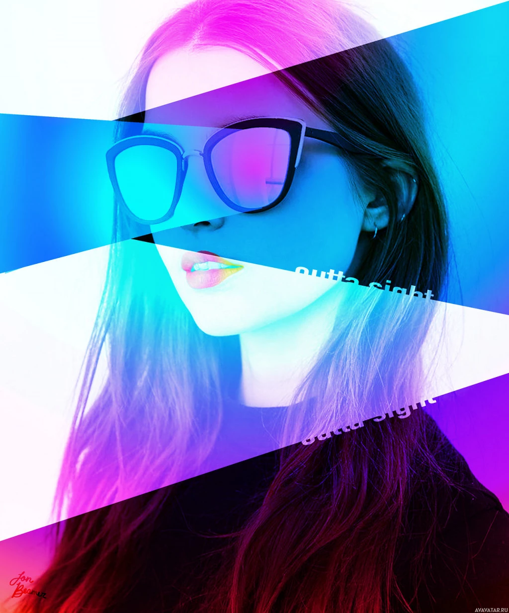 long hair. Behind her head, there are colorful shapes that look like abstract