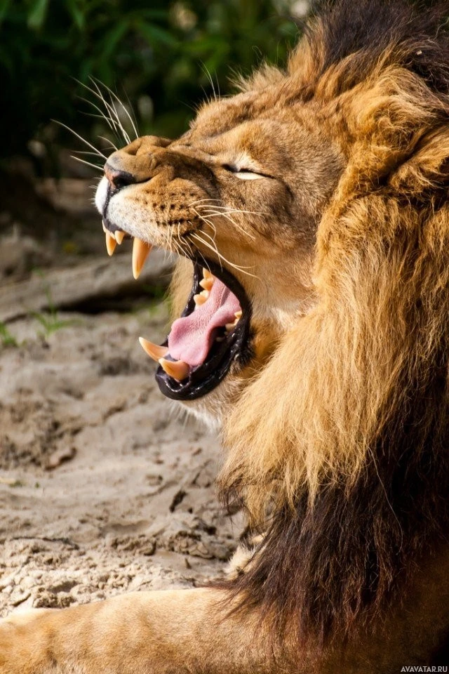 an outdoor setting. It appears to be yawning or roaring, with its mouth wide open and teeth exposed. There is