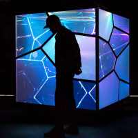 lit backdrop of the cube, which displays intricate digital patterns and designs in blue and purple hues. The setting suggests it might be an exhibit or installation at an event related to technology or art, where such interactive structures are often showcased for