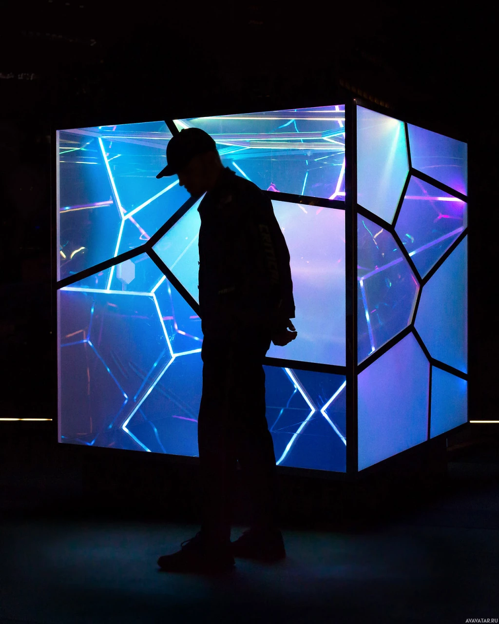 In the picture, there is a person standing next to an illuminated, cube-