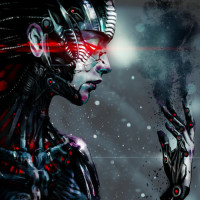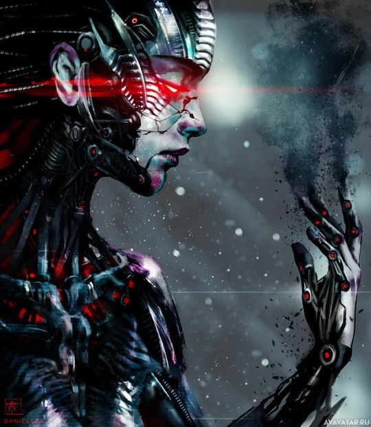 На картинке изображен человекоподобный робот с футуристическим дизайном. Он имеет металлическое и органическое тело со сложными механическими деталями, а робот обладает созерцательным выражением. Фон предполагает космическую или промышленную обстановку, возможно, в контексте научной фантастики.