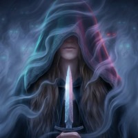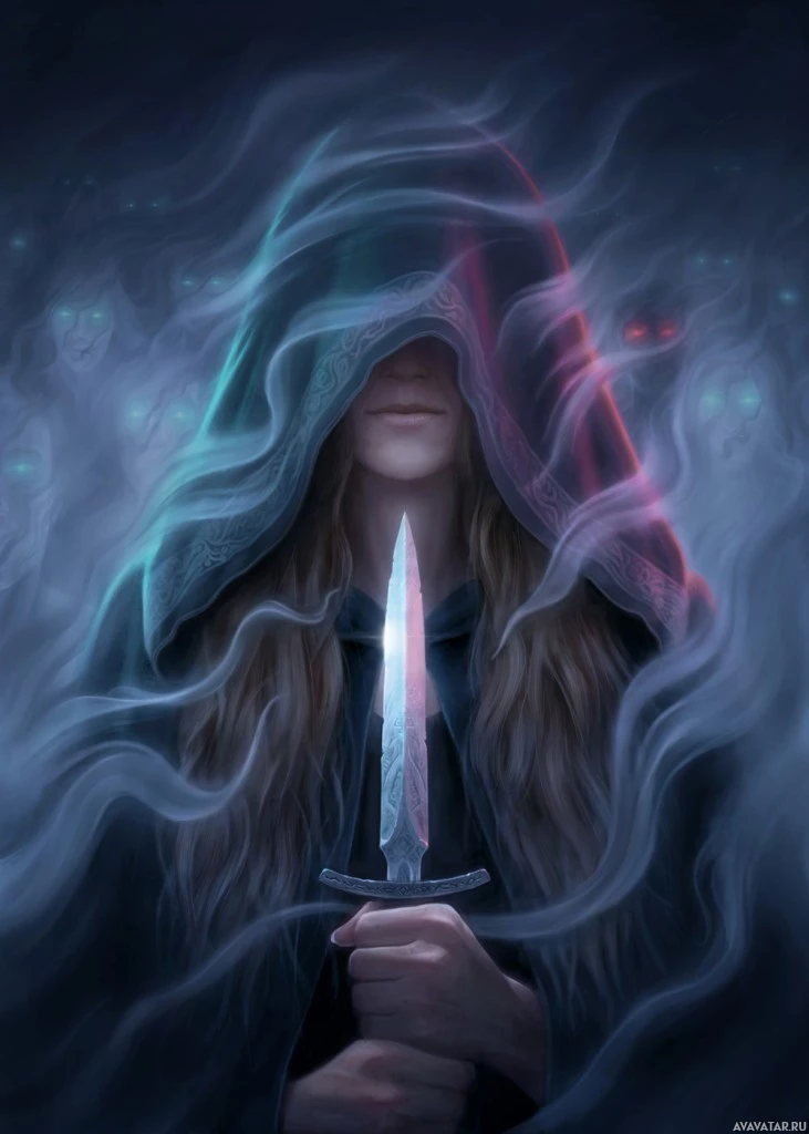 long hair and her face is partially obscured by the hood of her attire. In her hand, she holds what looks like a knife with both hands, as if ready for combat or