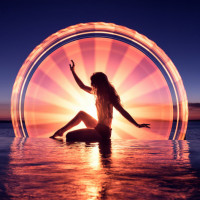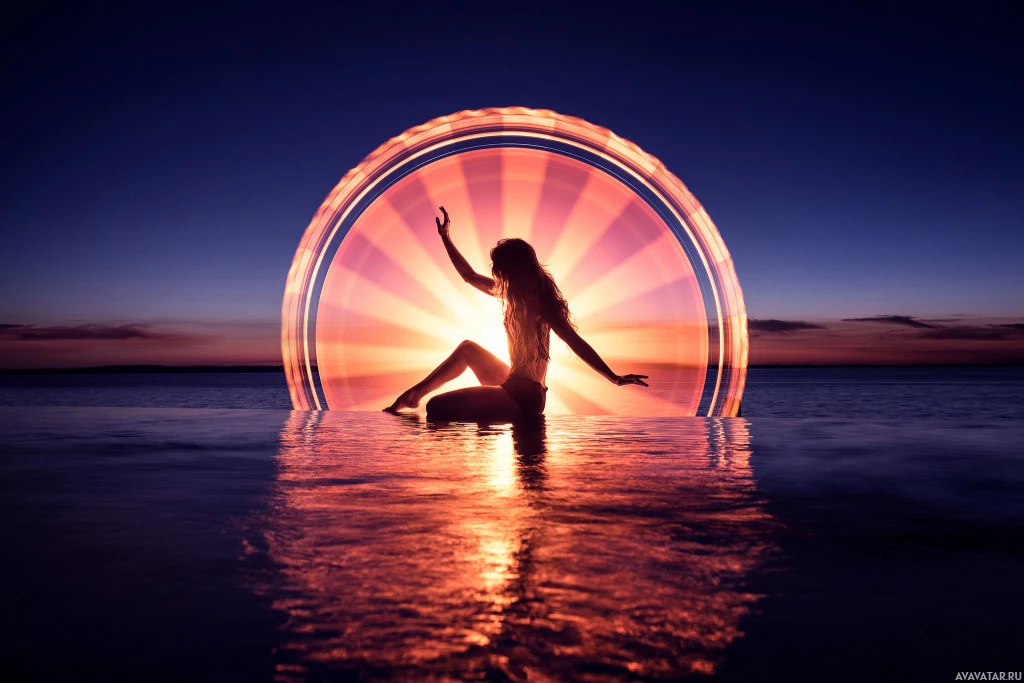 На картинке изображен силуэт девушки перед закатом. Она сидит на песке у кромки воды, возможно, возле пляжа или береговой линии. Свет от заходящего солнца отбрасывает вокруг нее теплое свечение, и перед ней появляется освещенный круг или кольцо, что может указывать на то, что она позирует для фотографии или что это может быть художественный элемент, добавленный к изображению. Общая сцена передает ощущение спокойствия и красоты.