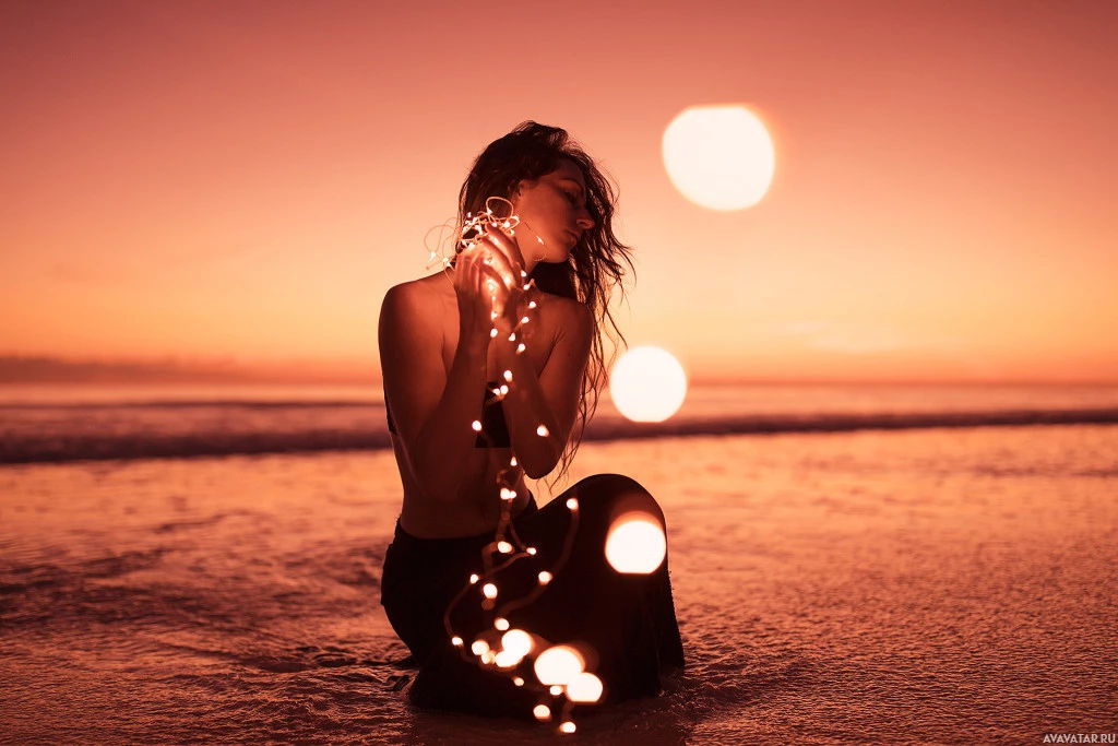 hues of orange and pink in the sky, suggesting it might be during a summer evening or around an equinox. The individual appears to be holding something small, which could possibly be a bottle or container emitting sparks. There are also some lights floating around them, adding to the magical