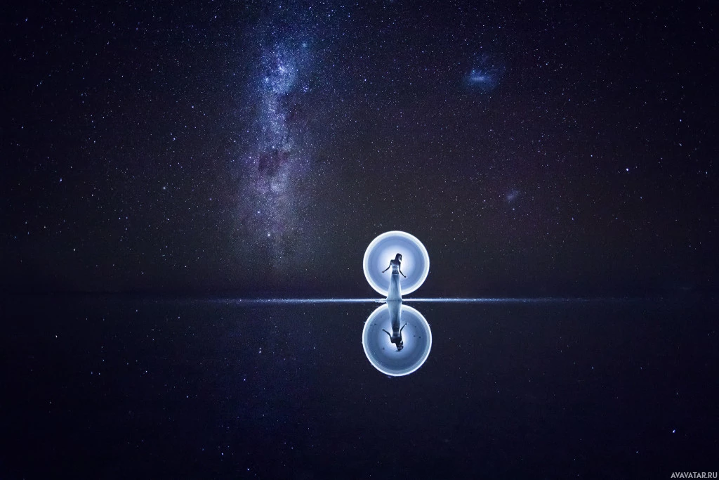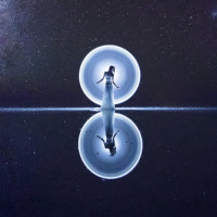 night sky filled with stars, suggesting an extraterrestrial environment. In the foreground, there is a symbol that appears to be a pair of intertwined circles or perhaps two planets orbiting each other. This could symbolize unity, partnership, or the cosmic