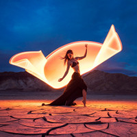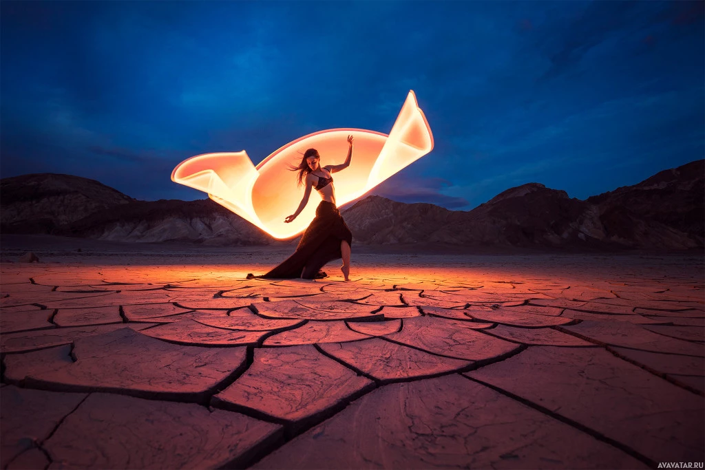 a long dress that reaches the ground and is holding what looks like a large glowing lantern or light source above her head with both hands, creating an elegant arc of light against the darkness. The backdrop features a rugged terrain with cracked earth and sparse vegetation, which complements