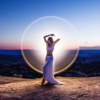 The image depicts a person meditating or performing an act of light concentration. They are surrounded by natural scenery, possibly at sunrise or sunset given