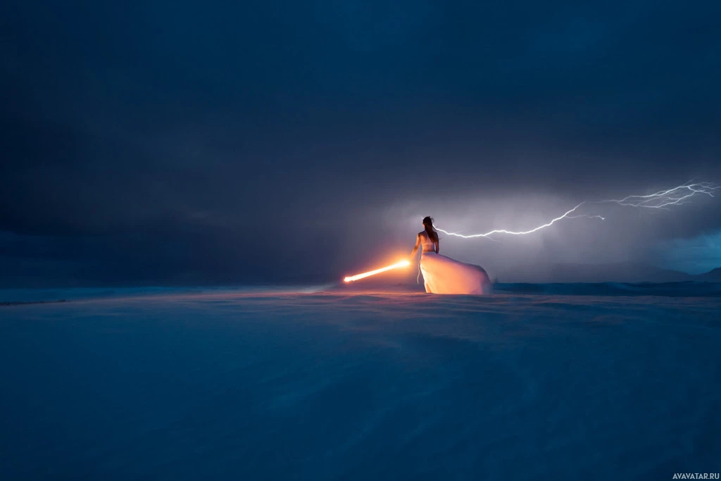 lightning bolts visible above the individual. The person is wearing a dress, but it's not clear if this is part of an actual outfit or if the image has been edited to add such a detail. The overall atmosphere suggests a dramatic moment captured, possibly related to the stormy weather indicated by the lightning and