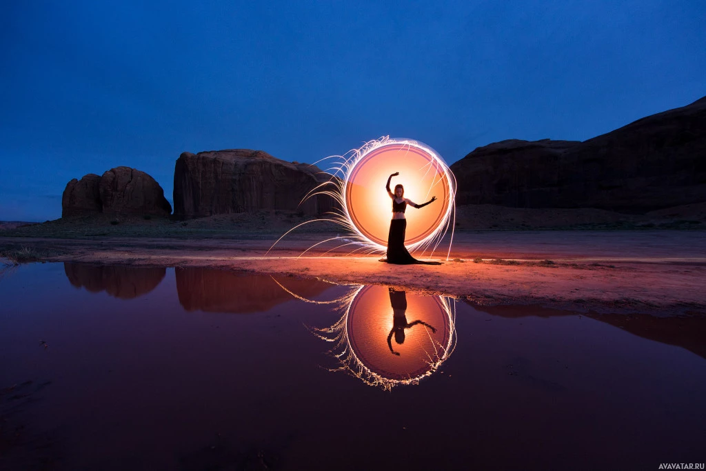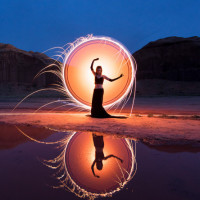 The image shows a person standing in the center with their arms raised, possibly performing a dance or striking a pose. There's a light source emanating from them that creates an interesting reflection on