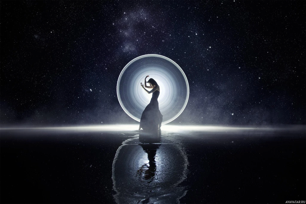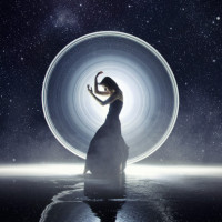 circular structure or object that she seems to be interacting with. The lighting gives off a mystical or otherworldly vibe. The image has been edited for