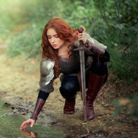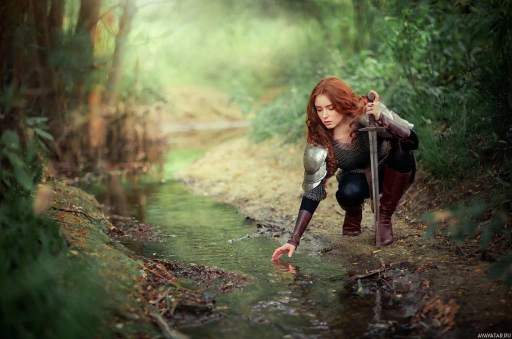 a small stream or creek, with her hand extended towards the water as if she is interacting with it, possibly dipping her hand into the water or touching something submerged. She is wearing what looks like a fantasy-inspired costume that could be interpreted as a knight's armor, including