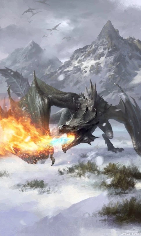 a fantasy scene with a dragon and a human-like figure. The dragon has wings and is depicted breathing out a blast of fire towards the human, who appears to be wielding some kind of