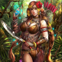 the fantastical nature of the image. The background is a lush, tropical jungle with dense foliage, which contrasts with her armored appearance, creating an interesting juxtaposition between the character's warrior-like attire and the peaceful,