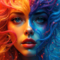 the vivid hues of the woman's features. There is also a subtle sparkle or glitter effect throughout the image that adds to