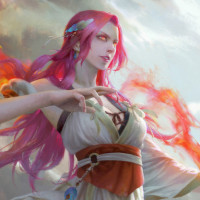 The image features a female character with pink hair, dressed in what appears to be fantasy-style armor. She is holding out flaming torches or sparks that seem to emanate from her hand. The background has dramatic clouds and a dynamic feel, suggesting she might be a powerful figure in a fantasy setting.