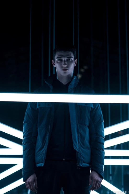 short hair and are looking directly at the camera with a neutral expression on their face. The lighting creates