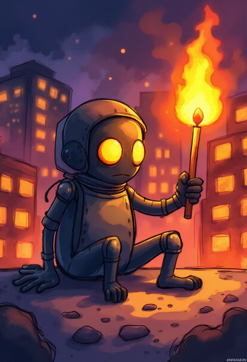 rocky ground at night. The robot is holding up two torches, one in each hand, which are glowing with flames. In the background, there's