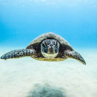 На снимке изображена морская черепаха, плавающая под водой. По-видимому, черепаха движется со скоростью, возможно, через водную колонну или ныряет к дну океана. Над поверхностью воды и песчаным морским дном под ней видно ясное голубое небо, что указывает на то, что это может быть вблизи береговой линии. В центре внимания изображения находится черепаха, захватывающая свой силуэт на обширном пространстве моря.