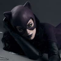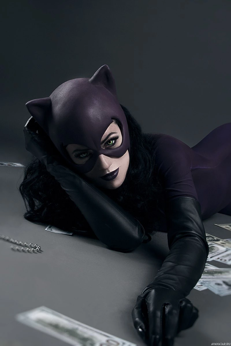 the television show "Miraculous: Tales of Ladybug & Cat Noir." She is lying on her stomach with one hand resting under her chin and the other touching the floor. There are banknotes scattered around her. Her outfit consists of a mask that resembles a cat's head, complete with ears, and a costume that matches the theme. The setting appears to be a studio or a themed environment designed for photography purposes.