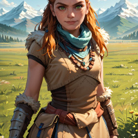 a utility belt that holds various tools and items. The artwork style suggests it's from the game's promotional material or a piece of fan art inspired by the character design in "Horizon Zero Dawn."