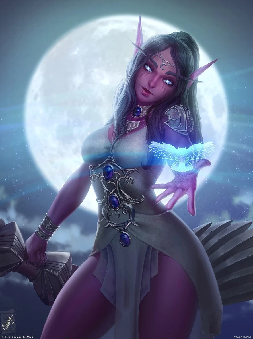 The image depicts a fantasy-themed artwork. It features a character that resembles a drow, which is a type of
