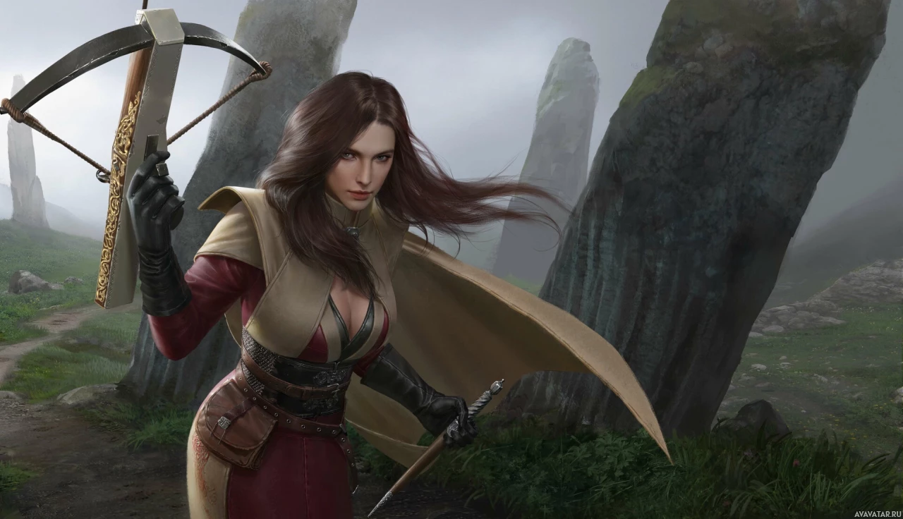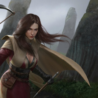 long hair that blows in the wind. In her belt, there seems to be an item that could be related to archery or adventure. Behind her are large rocks and a misty background that gives the scene