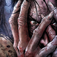 blood on the ground and what looks like dirt or mud splattered around them, indicating that there may have been some sort of violent act or struggle. The character's expression conveys