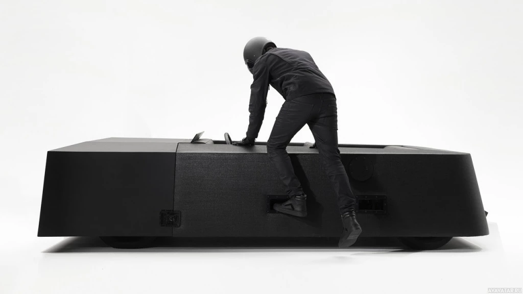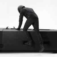 protective gear, which includes a helmet and what appears to be a high-visibility vest. They are kneeling or squatting on the ground next to a large, elongated object that looks like a modern sculpture or art installation made of black material with