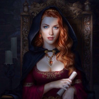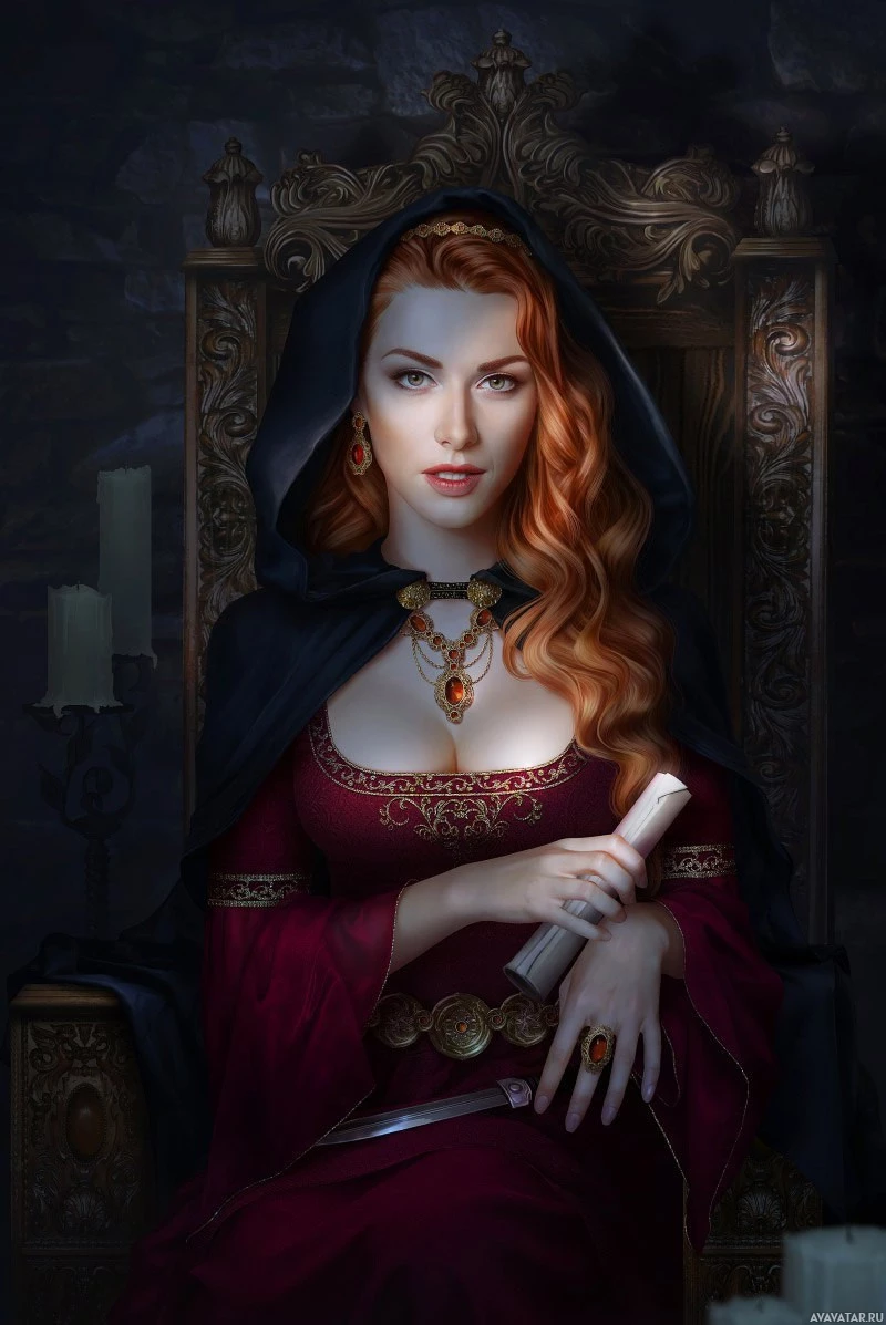 fantasy attire, possibly representing a character from a story set in the Middle Ages or a similar time period. She is seated on a throne with a cape draped over her shoulders and has a sword by her side. Her expression is thoughtful or contemplative. There are candles nearby, suggesting