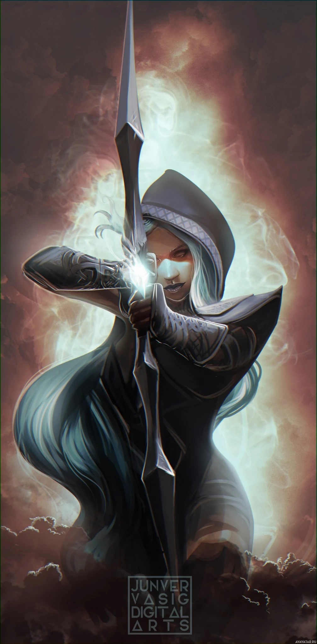 blue hair, wearing a hooded cloak and holding a bow in one hand and a quiver full of arrows on her back. Her pose suggests she might be preparing to shoot or has just shot the arrow from the bow. The background is somewhat dramatic, with darker tones around her, which could indicate a setting like a battlefield or a forest at night. There's also a watermark indicating that this image is copyrighted by "Fantasy Flight Games."