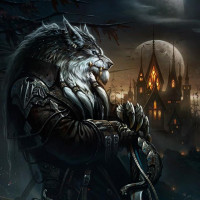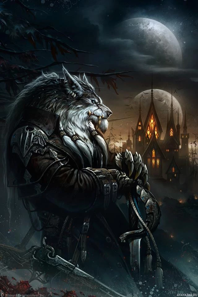 a human form, indicating it might have a humanoid shape when not transformed into its wolf form. In the background, there's an old,