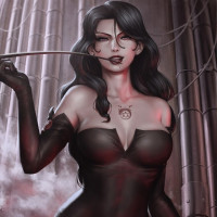 dark hair and striking red eyes, suggesting that she might be a character with supernatural abilities or a part of a story that involves elements of the unknown or magical realm. The image evokes a sense of mystery and allure typical of