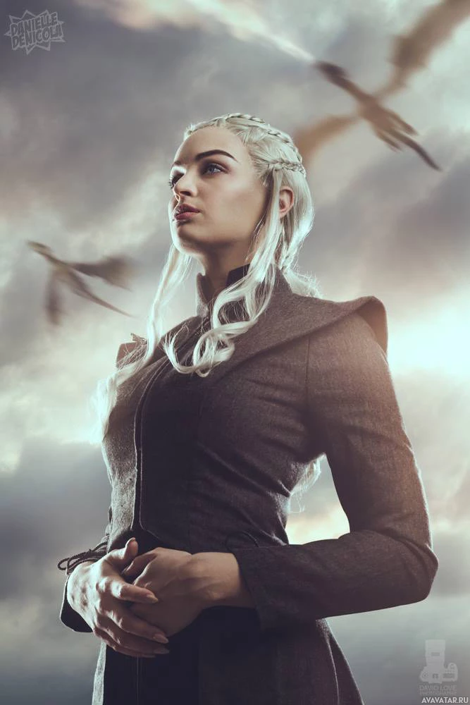 Daenerys Targaryen, a character from the television series "Game of Thrones." The individual is wearing a long coat and has wavy