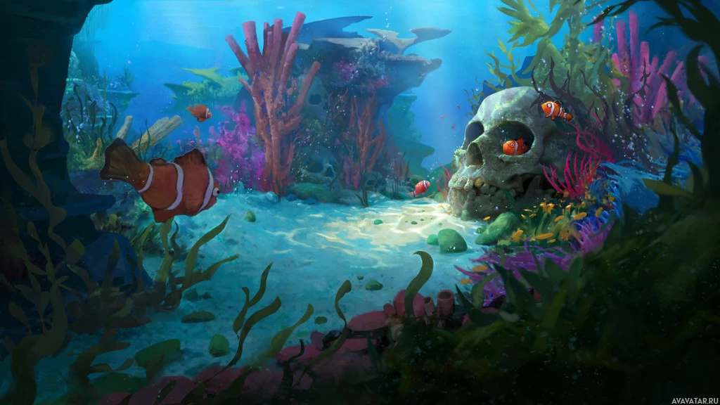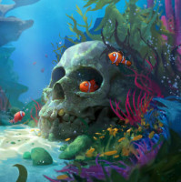 an underwater scene with various elements. There is a large skull placed on the left side of the frame, which adds a unique and somewhat eerie touch to the otherwise