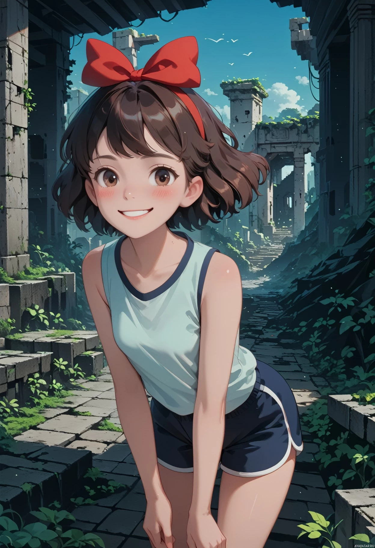 red bow adorns her hair, adding to her lively appearance. Her expression conveys joy, suggesting she is in