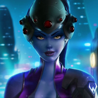 the video game Overwatch, specifically Widowmaker. She is depicted with a sleek and stylized design, wearing
