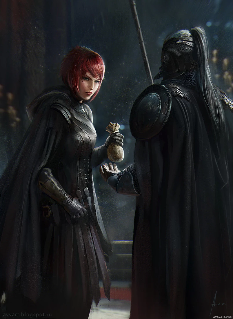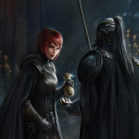 red hair, while the other character is dressed in black armor with a helmet that covers their face, leaving only the eyes visible. They both appear to be engaged in