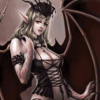 The image features a fantasy-themed illustration of a character that appears to be a succubus. This is indicated by the wings and horns typical of depictions in fantasy artwork. She has an ethereal, seductive quality and is styled in attire that may suggest she is from anotherworld or dimension within the context of this image's fantastical theme. The character is designed with attention to detail, highlighting a blend of human and otherworldly features.