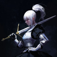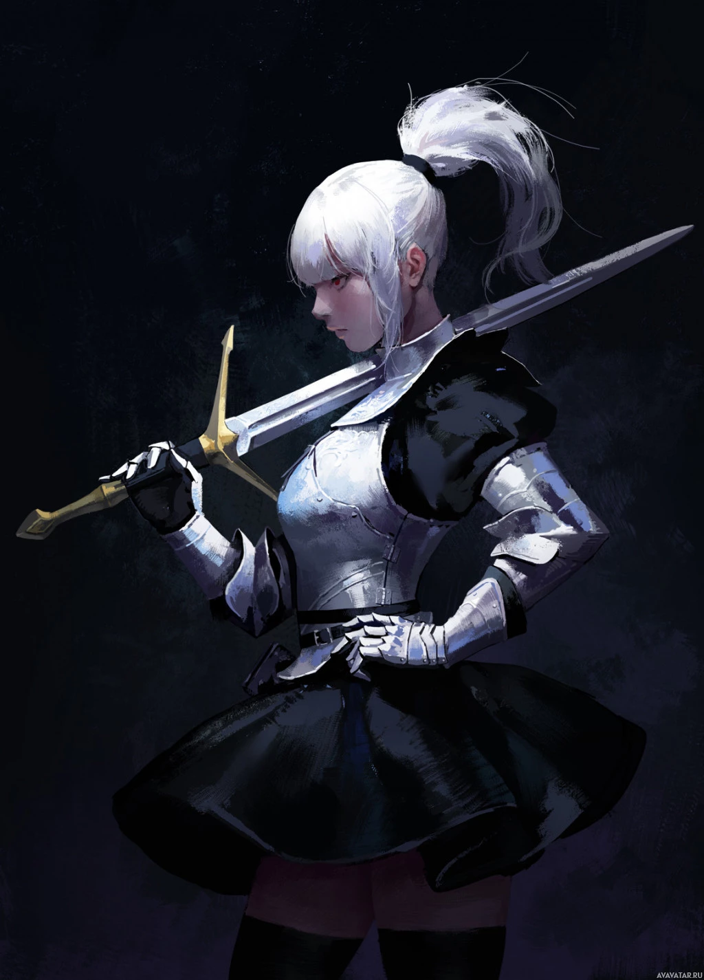 suit of armor that appears to be made of silver, and she has a sword slung over her shoulder. The character seems to be looking down or at something specific off-camera, which gives her an introspective appearance. The setting looks like a dark or dungeon-like environment, suggesting the scene might be taking place in a fantasy or